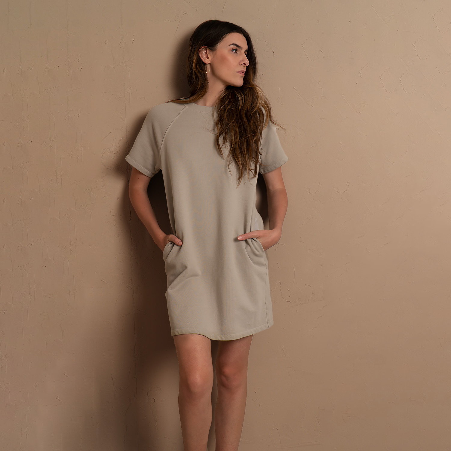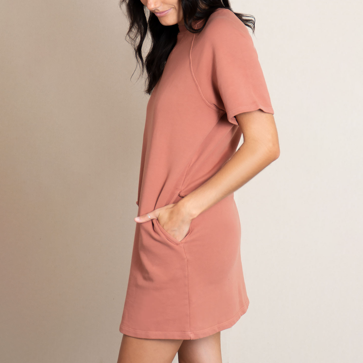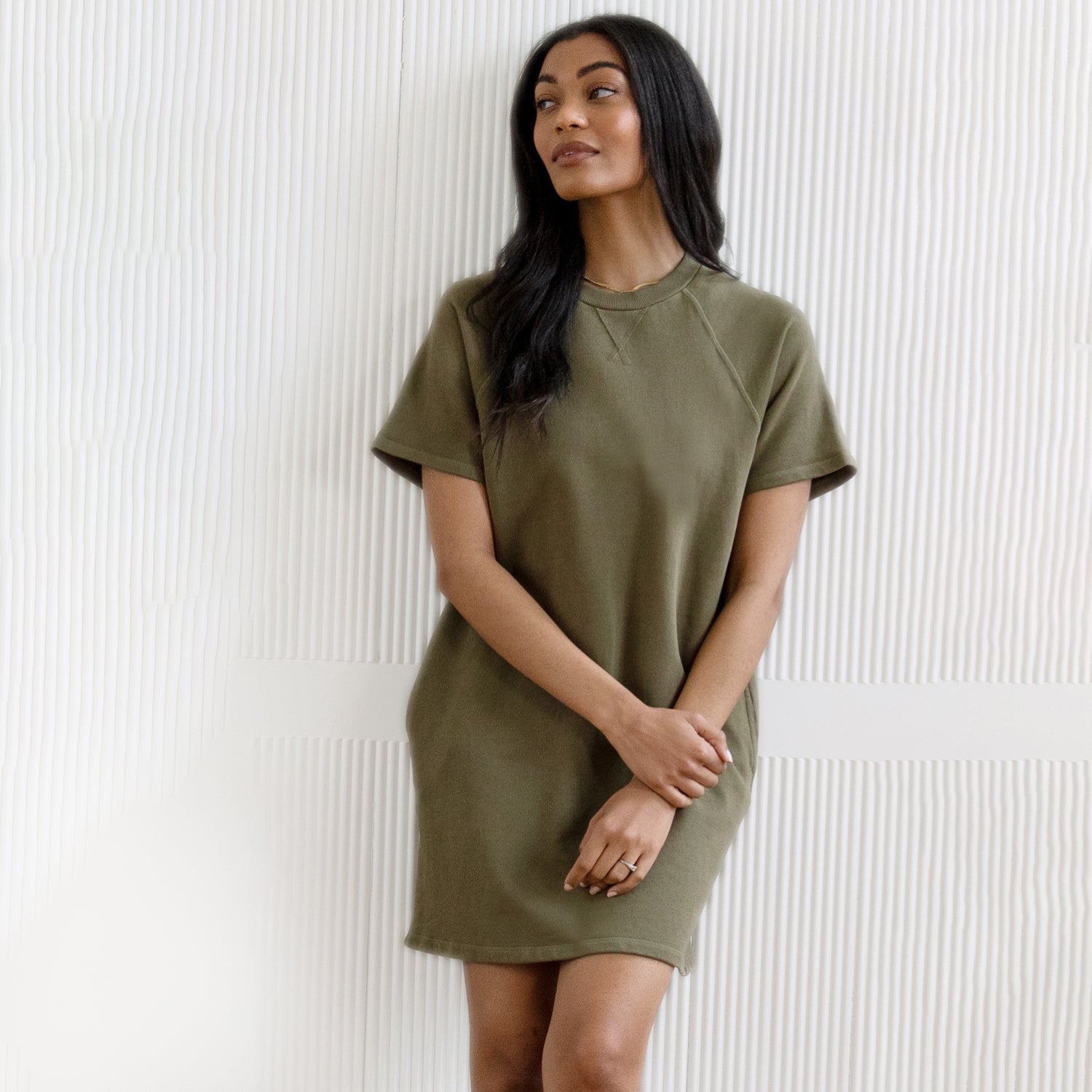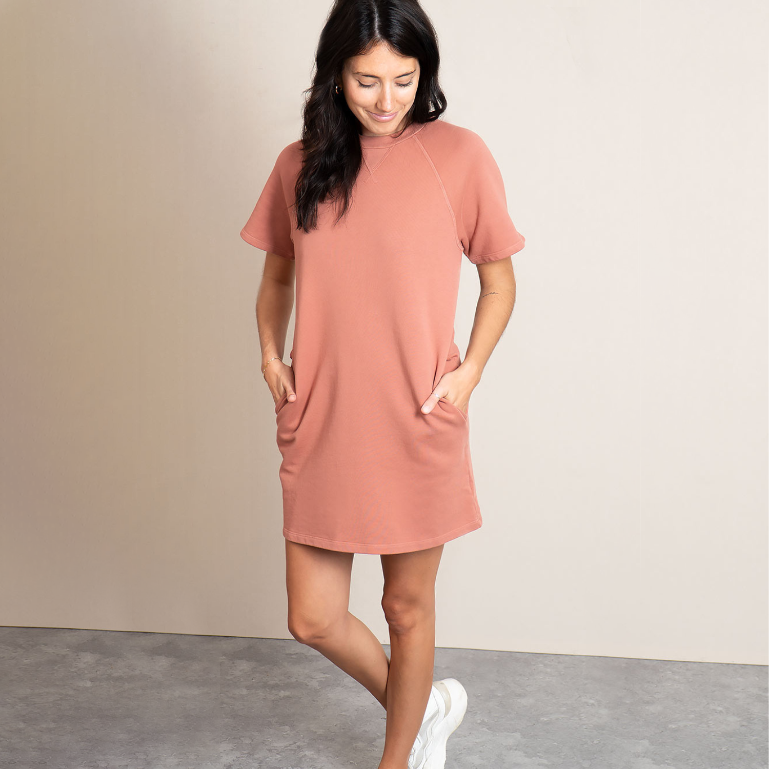 Introducing the new short sleeve sweatshirt dress. It will be your new favorite go-to piece. The raglan shoulders, ribbed neckline, and v-neck detailing gives this a chic/sporty look. This dress has a relaxed fit that hits just above the knee and has additional hidden side pockets. Pair with your favorite sneakers or throw on your comfy slippers for easy loungewear.